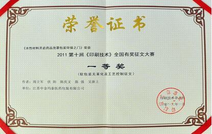 2012年1月,由本公司周立軍、伏陽(yáng)、陳慶文、陳強(qiáng)、吳新上等五位科技人員撰寫(xiě)的論文《水性材料開(kāi)啟藥品泡罩包裝環(huán)保之門(mén)》榮獲2011第十屆《印刷技術(shù)》全國(guó)有獎(jiǎng)?wù)魑拇筚愐坏泉?jiǎng)。 軟包裝無(wú)苯化已成為不可逆轉(zhuǎn)的潮流。這篇論文是上述科技人員在本公司實(shí)行無(wú)苯化進(jìn)程中的獨(dú)到見(jiàn)解和心得體會(huì),深受專(zhuān)家評(píng)委好評(píng)。本篇論文是該主題全國(guó)唯一的一個(gè)一等獎(jiǎng)。