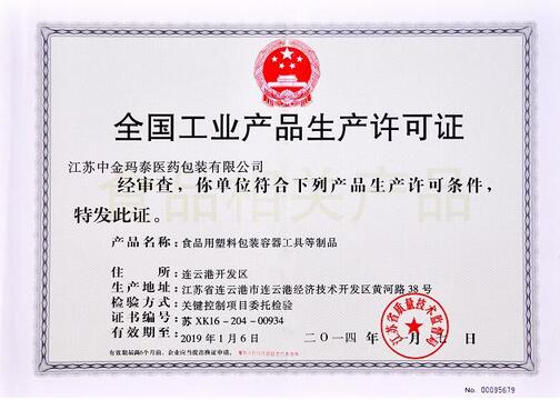 2014年1月7日,我公司食品用塑料包裝生產許可證順利更換新的生產許可證。這是公司第三次換證。許可證號由原來的“QS32-10101-00133”更換為現在的“蘇XK16-204-00934”。生產許可范圍為“BOPA/LDPE復合膜袋及內層為PP、PE多層企標類復合膜袋”,生產許可證的有效期至2019年1月6日。