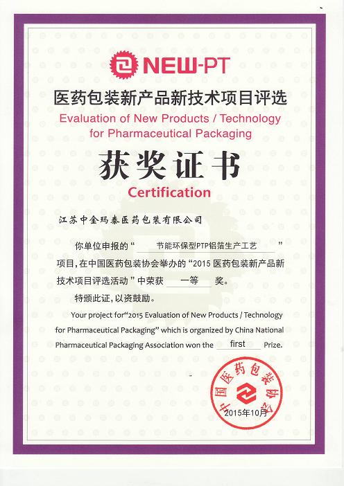 近日,在醫(yī)藥包裝新產(chǎn)品新技術(shù)獲獎(jiǎng)項(xiàng)目發(fā)布會(huì)上,我公司“節(jié)能環(huán)保型PTP鋁箔生產(chǎn)工藝”榮獲中國醫(yī)藥包裝協(xié)會(huì)頒發(fā)的2015醫(yī)藥包裝新產(chǎn)品新技術(shù)項(xiàng)目評(píng)選一等獎(jiǎng)。