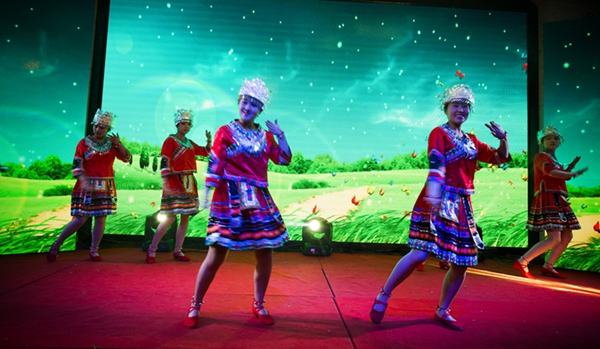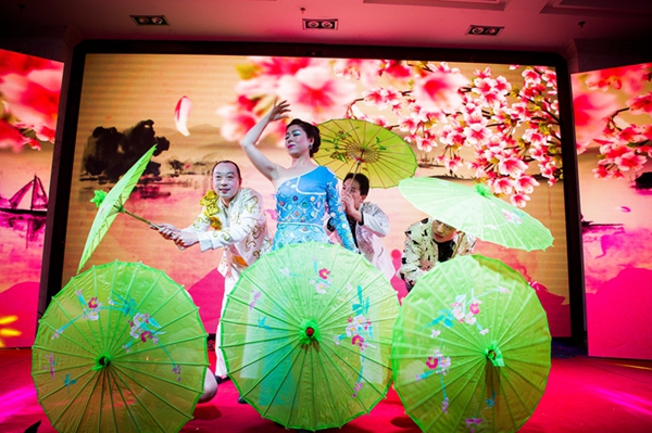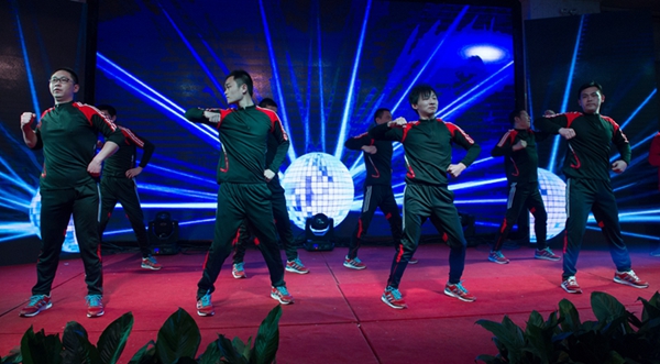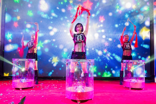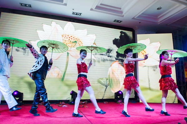來自世紀緣大酒店的姑娘們頭戴銀飾,身著艷麗的服裝,跳著活潑歡快的侗族舞蹈《多嘎多耶》,讓觀眾們眼前一亮。技術質量部帶來的《舞舞相約》,一個個撐著油紙傘款款走來的姑娘們,讓觀眾仿佛置身于淡墨淺韻的江南水鄉,那曼妙動人、搖曳生姿的孔雀舞更是驚艷四座。二工廠帶來的《鼓舞2016》,帥哥美女們頭戴五彩花環,穿著飄揚的草裙,用火辣多情的草裙舞贏得了臺下觀眾的陣陣歡呼。最振奮人心的莫過于集聲、光、水景為一體的水鼓舞氣勢恢宏,充分演繹出燦爛振奮的舞風和鼓韻。生產計劃部那充滿異域風情的新疆舞《掀起你的蓋頭來》以其艷麗的服飾、歡快的旋律、大膽的反串以及場上場下的精彩互動,更是將全場觀眾的熱情點燃。小品《考核》、《偶像劇》以及相聲《港城文化人》也是引爆全場,喜劇夸張的表演,幽默詼諧,笑料百出,引得觀眾掌聲連連,笑聲不斷。