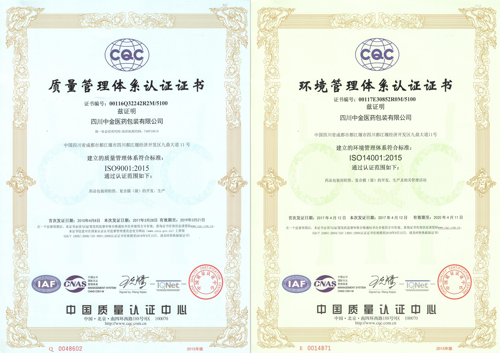 近日,四川中金醫(yī)藥包裝有限公司收到了由中國(guó)質(zhì)量認(rèn)證中心頒發(fā)的《ISO90012015質(zhì)量管理體系認(rèn)證證書》、《ISO14001:2015環(huán)境管理體系認(rèn)證證書》,這也標(biāo)志著四川中金已建立起一套標(biāo)準(zhǔn)化、規(guī)范化的質(zhì)量、環(huán)境管理體系,公司在生產(chǎn)運(yùn)營(yíng)管理、產(chǎn)品質(zhì)量、市場(chǎng)銷售、客戶服務(wù)等方面得到全面的提升。